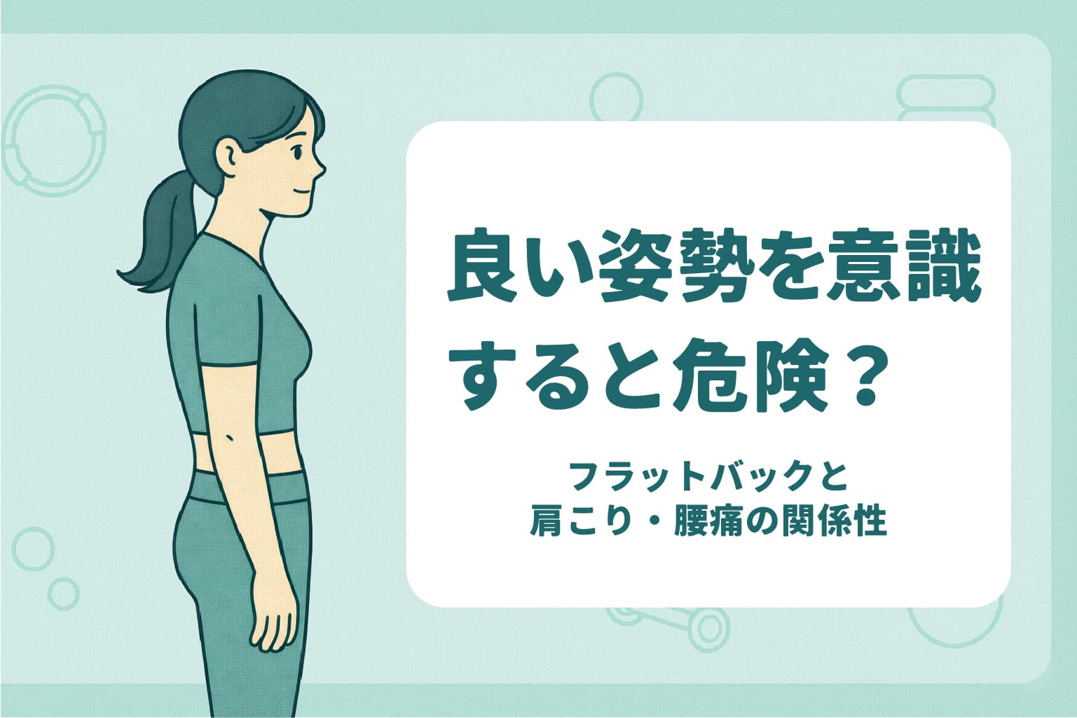 「ストレートネック+フラットバック」という姿勢に着目して、一見まっすぐに見えるこの姿勢からくる肩こりや腰痛の原因が何か。