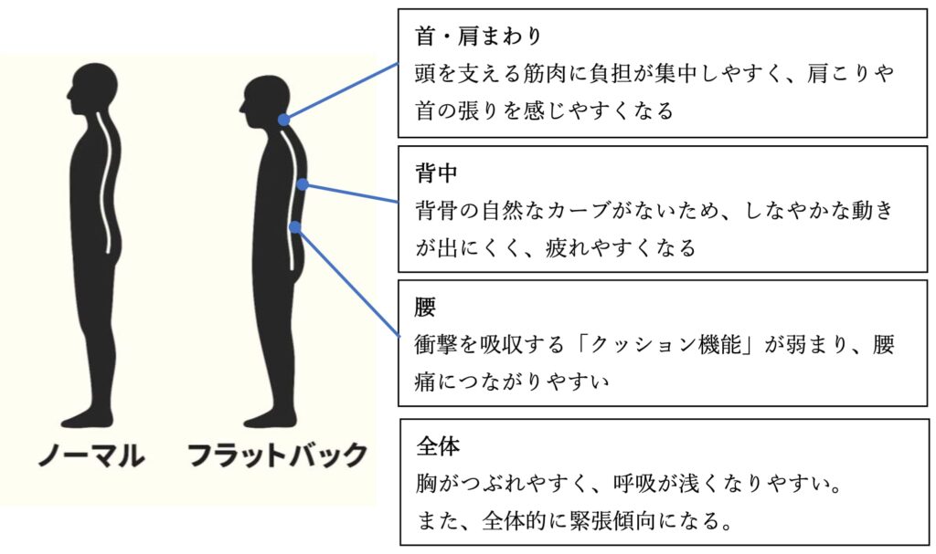 さらにフラットバックは、背中や腰の自然な丸みや反りがなくなり、全体的に平らになってしまう姿勢を指します。