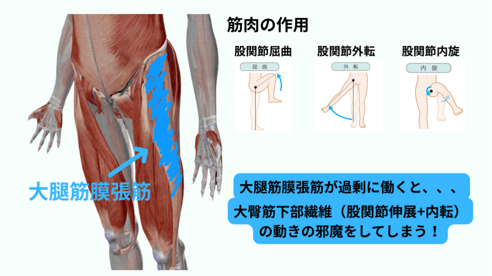 大臀筋下部繊維の筋肉の働きは股関節伸展+内転なので、大腿筋膜張筋が過剰に働くと、大臀筋下部繊維の活動を邪魔してしまう事になります。