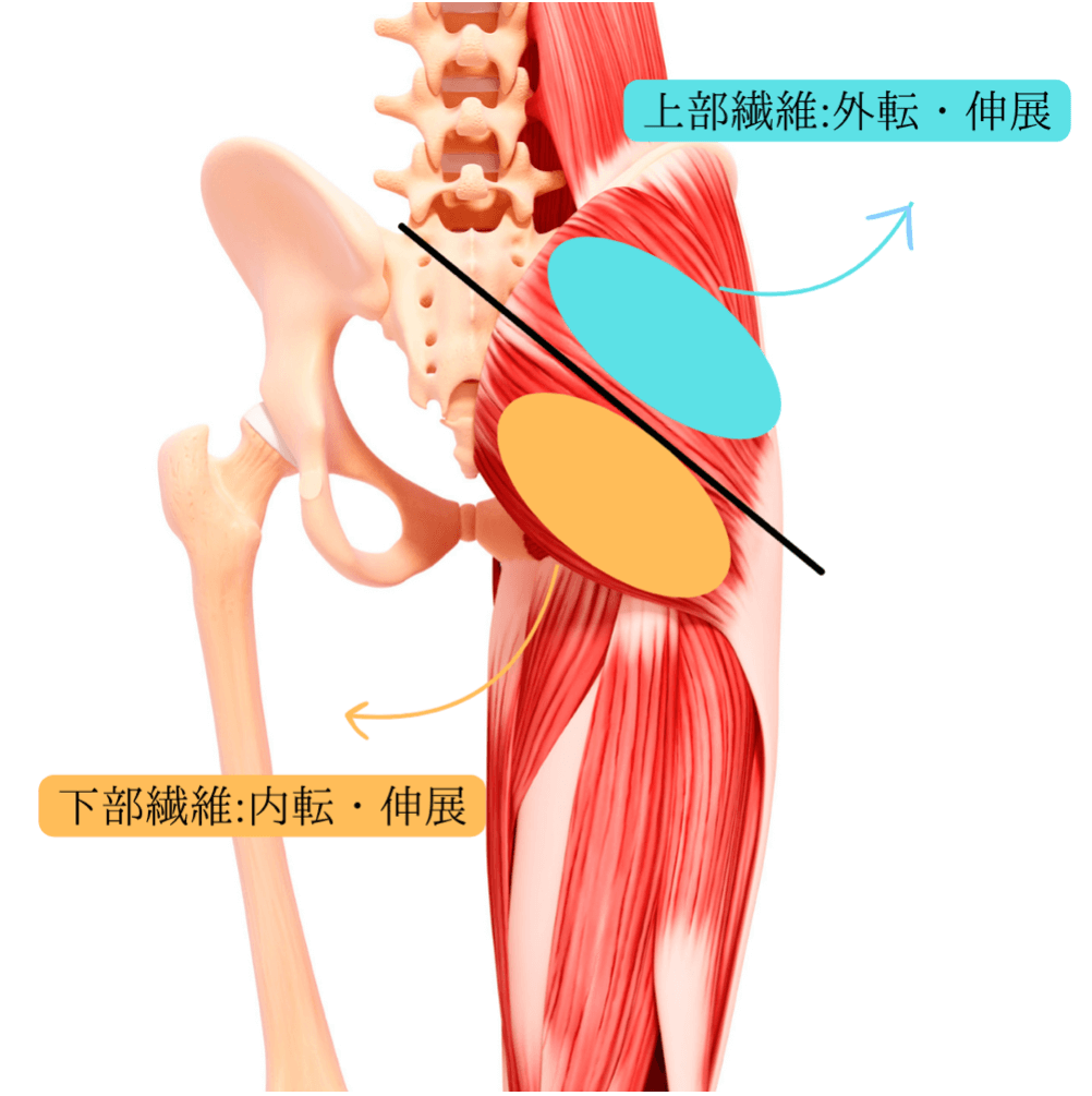 実は大臀筋は大きい筋肉なので上部と下部に分かれて、同じ筋肉なのに、作用が異なります。