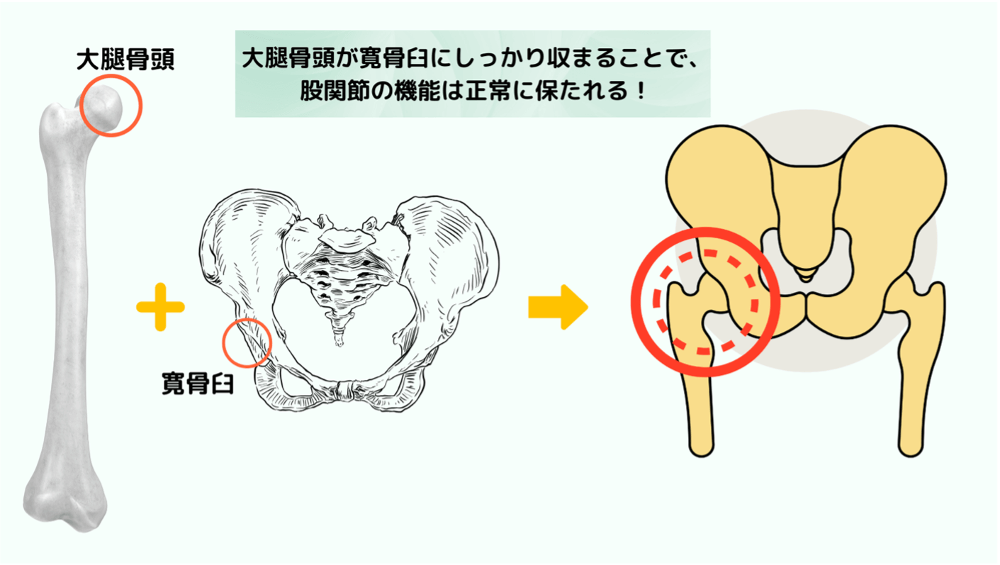 股関節の求心位とは、大腿骨頭(太ももの骨の丸い部分)が寛骨臼(骨盤の受け皿)にしっかりと収まっている状態のことです。この状態を保つことで、股関節の安定性が高まり、スムーズな動きが可能になります。求心位が崩れると、股関節の筋肉が使いづらくなり、痛みや可動域制限の原因になることがあります。