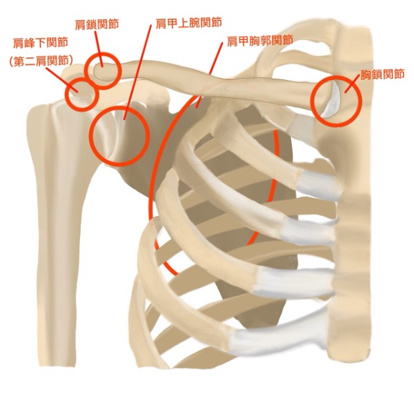 肩関節は他の関節と比べて可動域が広く様々な方向に動かすことができるようになっており、身体の中でもっとも複雑な構造をしているため下記のように複数の関節が存在します。