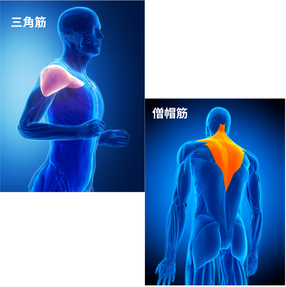 僧帽筋(特に上部・中部線維)→肩甲骨を引き上げたり、回旋を行う
