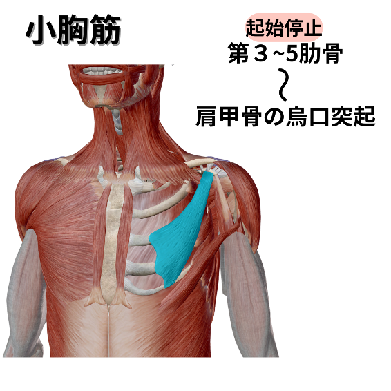 肩甲骨の烏口突起から肋骨まで着いている小胸筋。肩甲骨が様々な動きをする中で拮抗筋として働くのがこの小胸筋です。