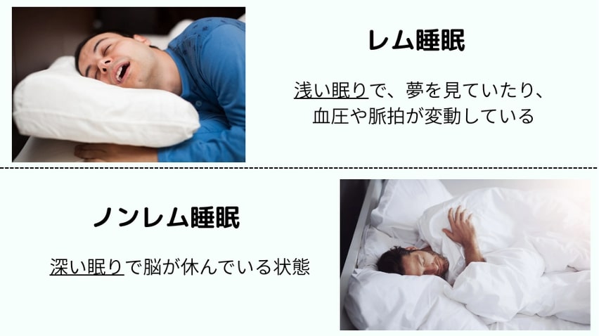 睡眠には「レム睡眠」「ノンレム睡眠」のという質の異なる2つの眠りで構成されています。レム睡眠は身体は休んでいる状態ではありますが、夢を見たり、血圧や脈拍が変動し、覚醒(目を覚ます)に近い浅い睡眠です。一方でノンレム睡眠は脳波活動が低下し、脳が休んでいる深い睡眠です。