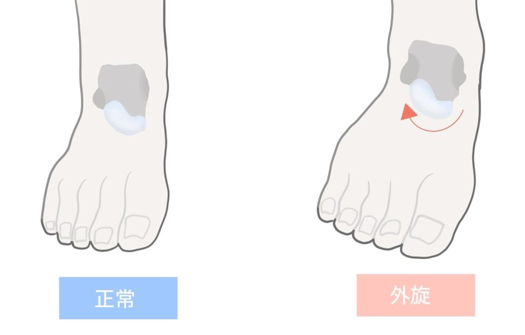 そのため、足のアーチが崩れたり、回内(かいない:土踏まずがつぶれるような動き)が強くなると、かかとの奥にある距骨(きょこつ)という骨が外方向に回転(外旋)します。